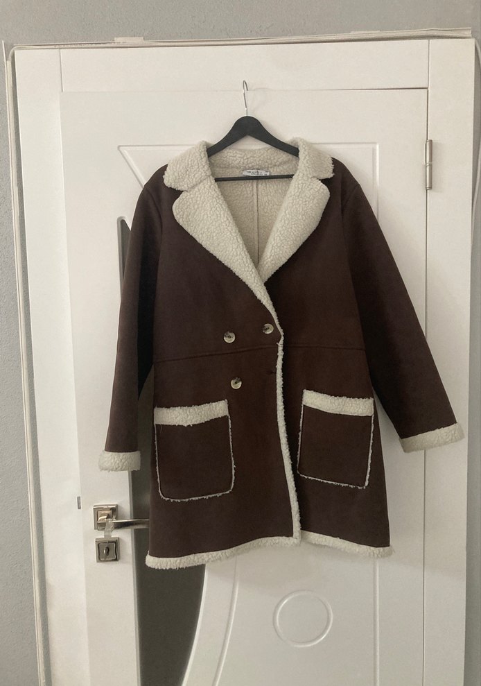 Kahverengi süet, kürklü detaylı, notched yaka ve bol kesim midi uzunlukta kadın ceket. Uzun kollu ve cep detaylı, günlük rahat kullanım için uygun.