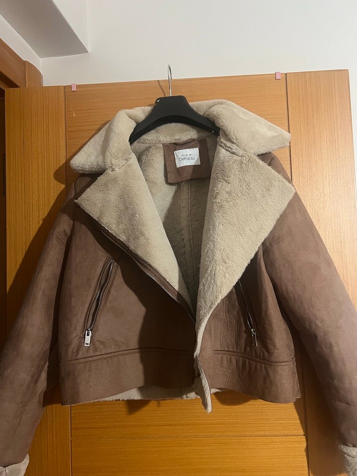 Kahverengi süet kumaştan yapılmış, kürklü yakalı ve uzun kollu kadın ceket. Regular fit, fermuarlı cepler ve desenli detaylara sahip, rahat ve şık bir parça.