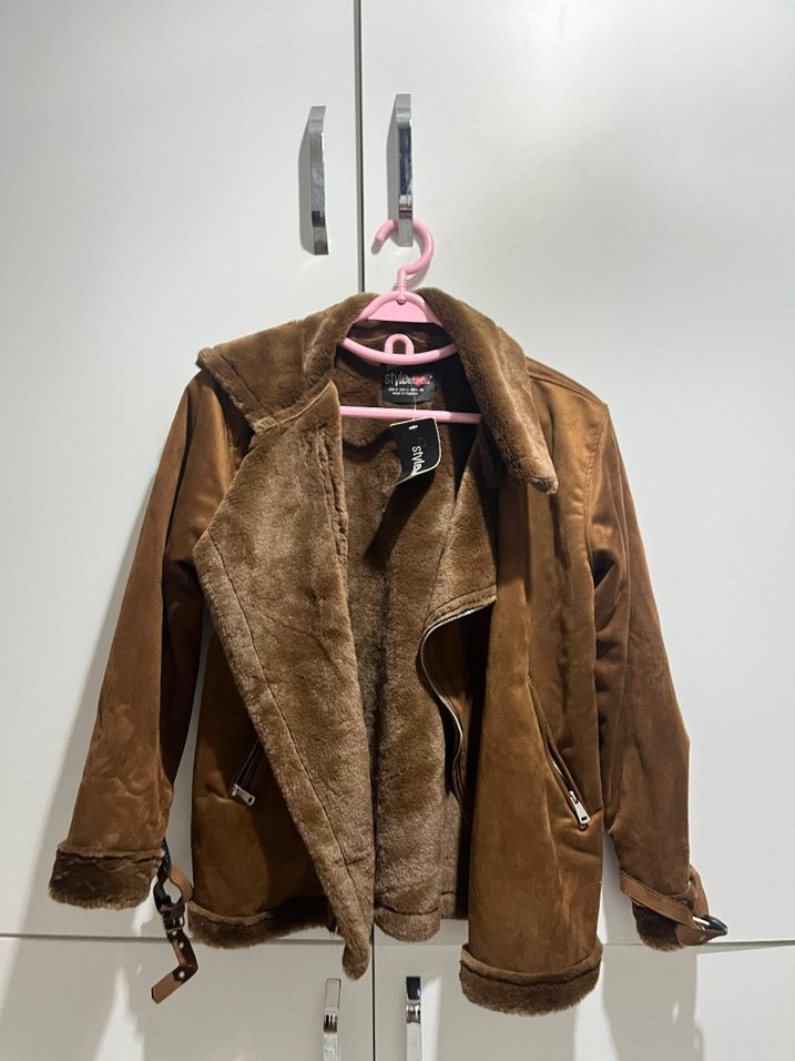 Kahverengi süet ceket, kürklü iç detayları ve kesik yaka ile trend rahat bir görünüm sunar. Midi boy, bol kesim ve askılı kolludur. Günlük kullanıma uygundur.