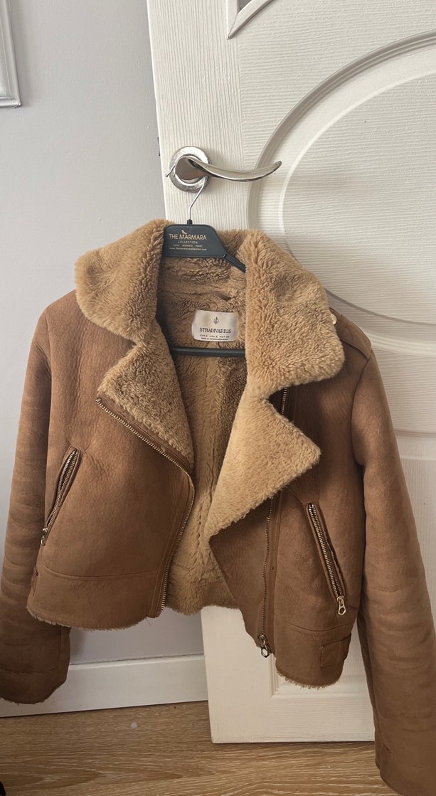 Kahverengi süet ceket, kürklü detaylı, parlak görünümlü, normal midi boyda, strappy kollu, trend sokak tarzı için uygun.