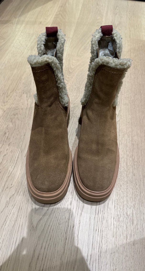 Kahverengi süet, kürklü detaylı kadın botları, dolgu topuklu ve rahat sokak stili için uygundur. Günlük kullanım için idealdir. Bir kez kullanıldı tomoris marka