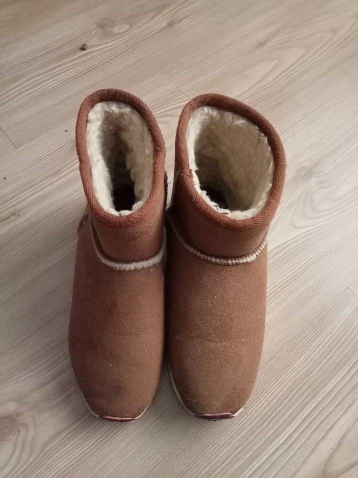 Kahverengi süet, kürklü astarlı ve dolgu topuklu kadın botları, günlük kullanım için sıcak ve rahat.