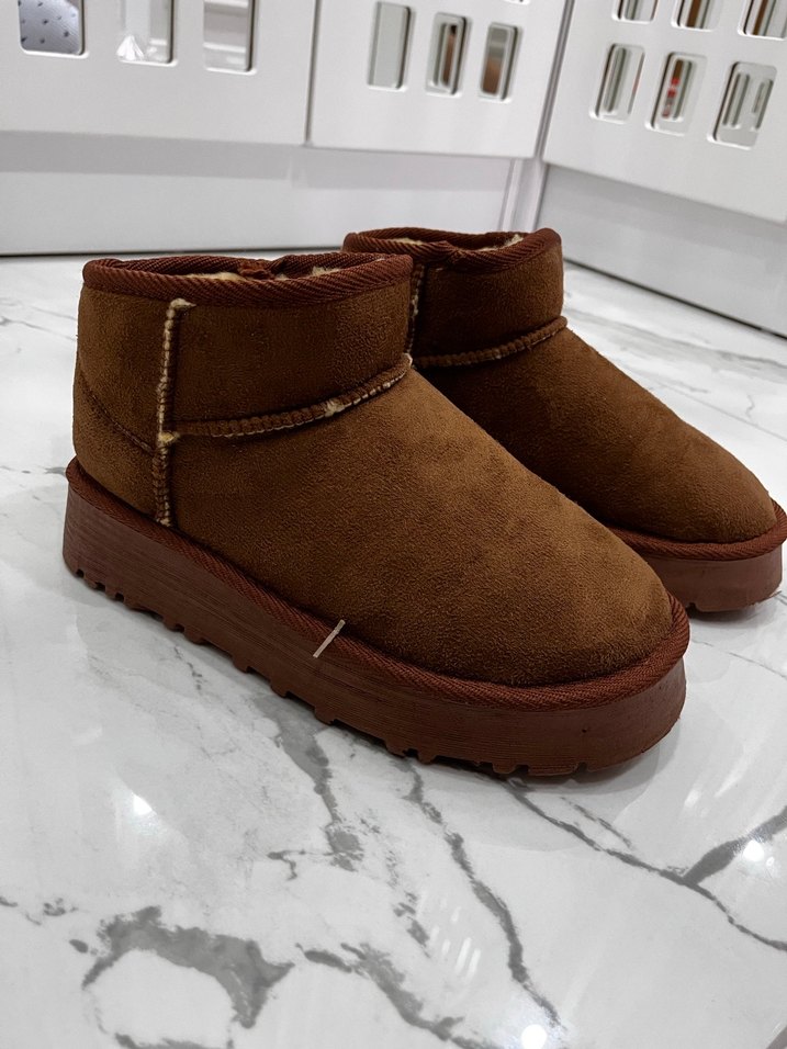 Kahverengi süet dolgu topuk botlar, kürk detaylı ve parlak görünümlü, günlük rahat ve şık kullanım için uygundur.