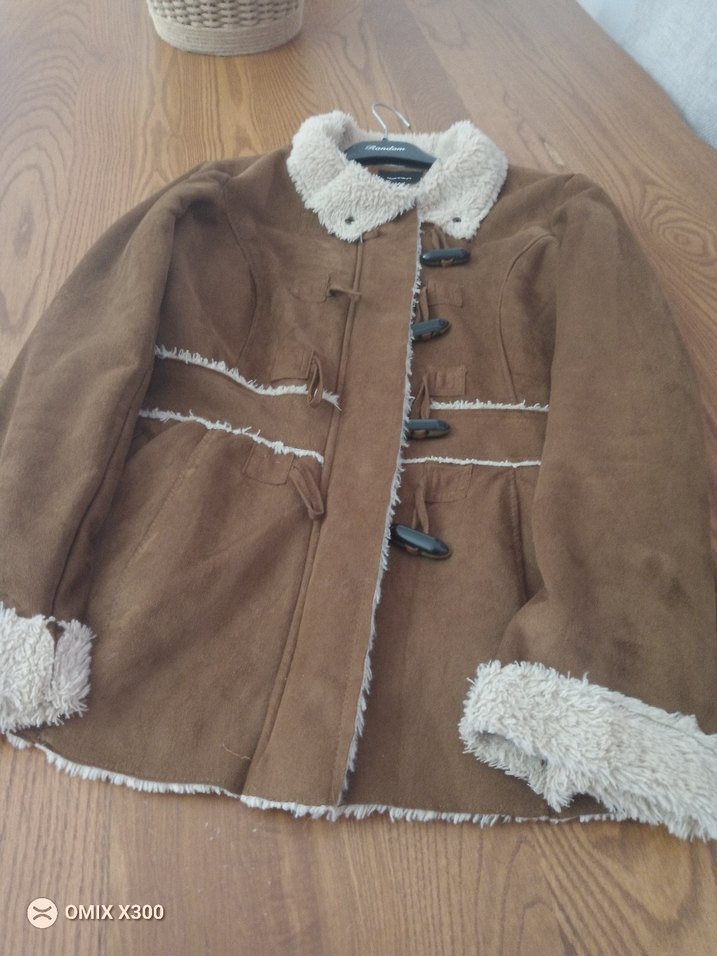 Kahverengi süet, kürklü detaylı kadın kaban Notlu yaka, uzun kollu,çok sıcak tutar içine tişört giy çık koltuk arası 51 cm uzunluk 67 cm