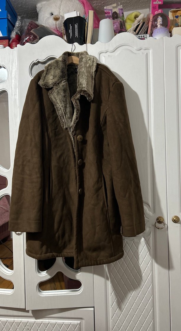 Kahverengi süet kumaştan, kürklü yakalı ve uzun kollu, midi boyda, sade ve rahat kesimli kadın kaban.