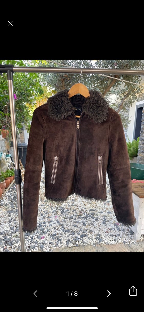 Kahverengi süet kumaştan yapılmış, kürklü yakalı ve uzun kollu, fitted kesim kadın mont. Normal boyda, fermuarlı ceplidir. Gerçek deri