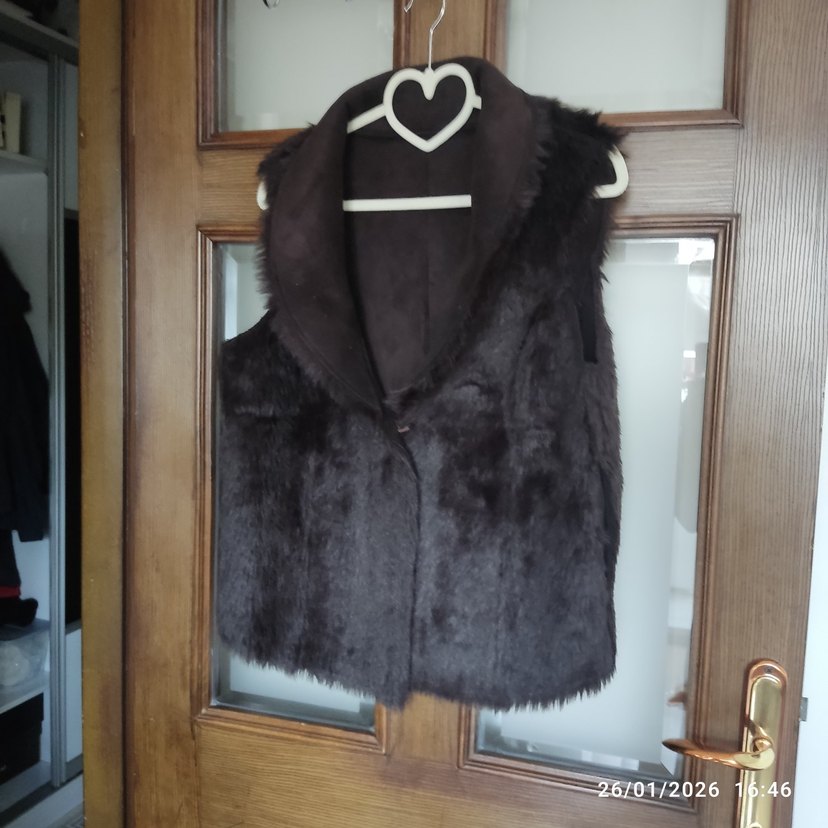 Kahverengi süet ve kürk detaylı, yakalı, kolsuz, midi uzunlukta, dar kesim kadın yeleği. Günlük kullanıma uygun.