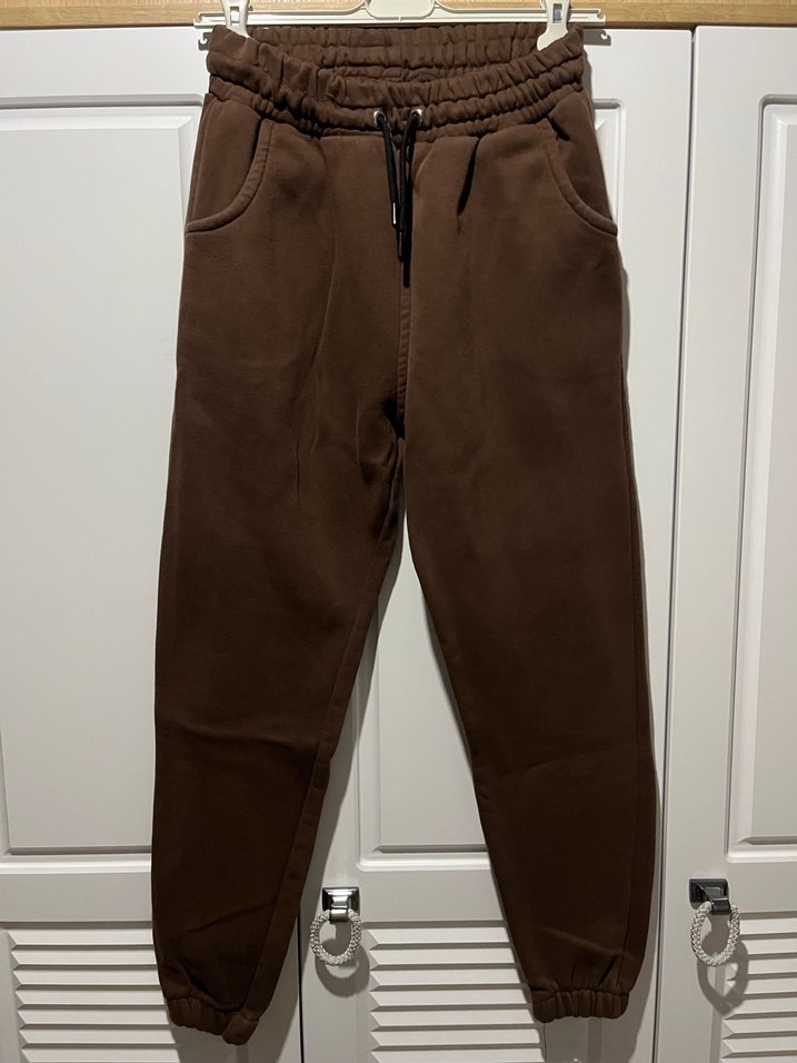 Kahverengi süet kumaştan, kuşaklı ve bol kesim kadın eşofman. Normal midi boy ve günlük kullanıma uygun sokak stili. ️