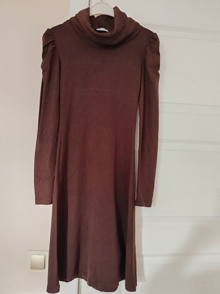 Yumuşak süet kumaştan, kahverengi midi ve dar kesim elbise. Yüksek yakalı, uzun kollu ve drapeli detaylı, rahat bohem tarzda günlük kullanım için uygun.