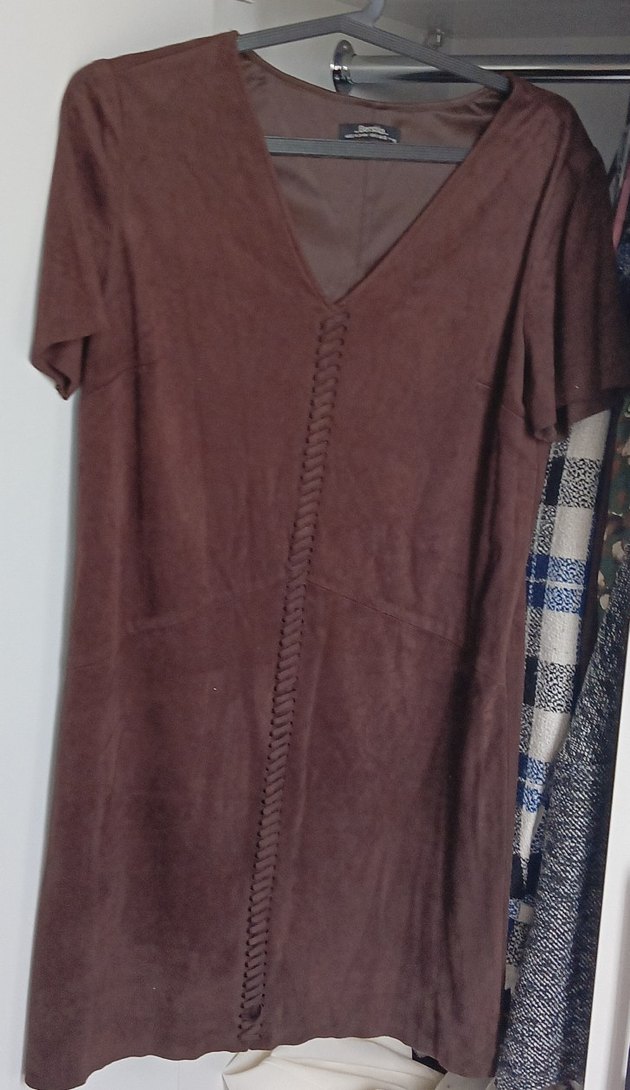 Kahverengi süet midi boy, bol kesim elbise. Kısa kollu, V yaka ve drapeli detaylara sahip bohem tarzda. Günlük kullanım için uygundur.
