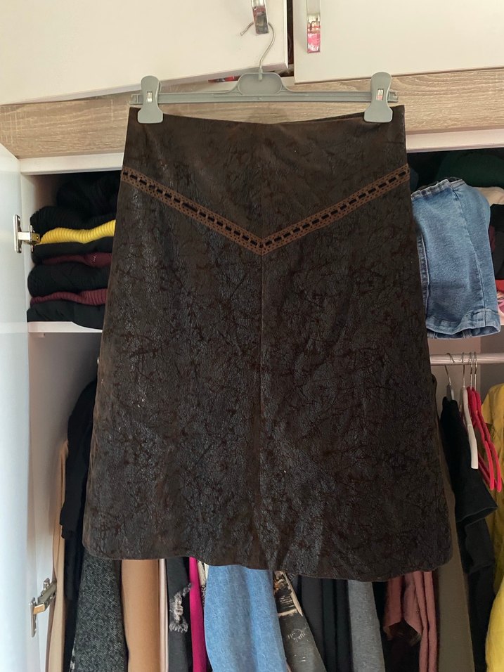 Kahverengi süet kumaştan, kemerli ve bohem tarzda, vintage dokunuşlu, midi boy ve vücuda oturan hamile eteği. Günlük kullanıma uygundur.