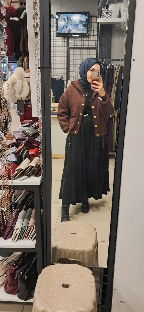 Kahverengi süet kumaştan, notalı yaka ve uzun kollu, bol kesim midi kadın ceket. Günlük kullanıma uygun, zahmetsiz şıklık sunar. #nesibe markası