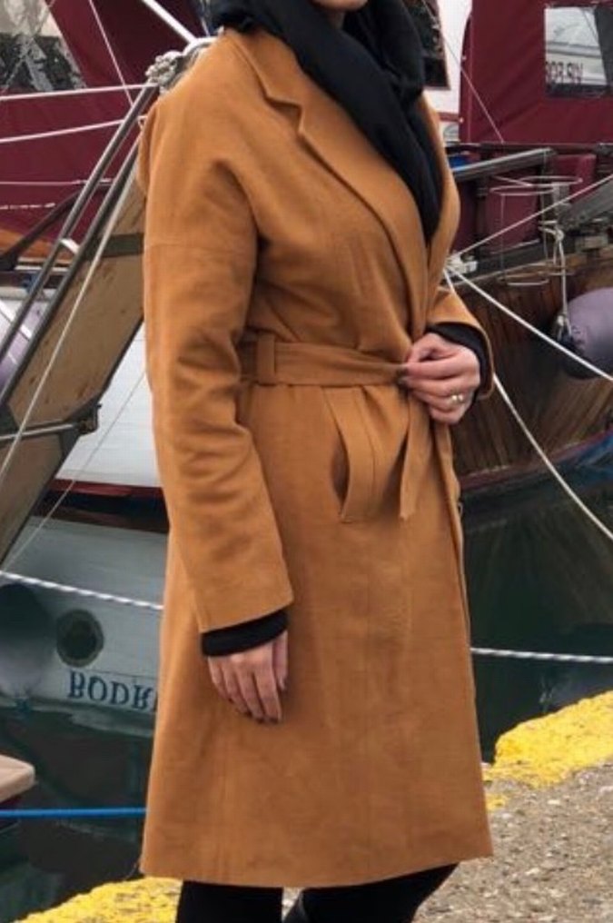 Kahverengi süet midi uzunlukta, kemerli ve kesimli yakalı kadın kabanı. Uzun kollu, desensiz ve günlük sokak stiline uygun rahat bir modeldir.