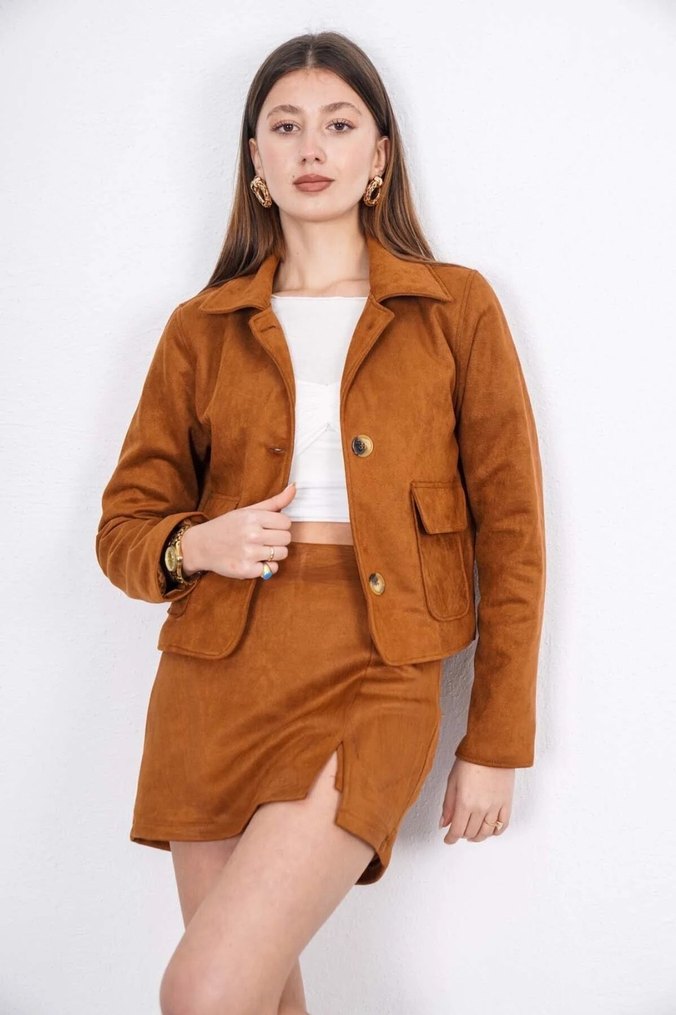 Kahverengi süet mini ceket, uzun kollu ve kesik yaka detaylıdır. Parlak ve desensiz yüzeyiyle minimalist sokak stili sunar, günlük kullanıma uygundur. Ürünün S-M-L bedenleri mevcuttur