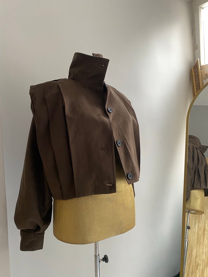 Kahverengi süet kumaştan, yakalı ve düğmeli kısa kesim ceket. Uzun kollu, sade tasarımıyla avant-garde sokak modasına uygun, günlük kullanım için ideal.