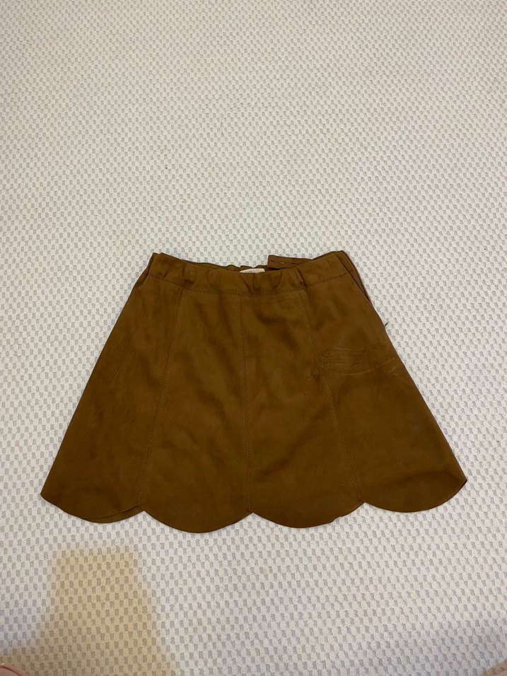 Kahverengi süet mini etek, asimetrik kesim ucu ve bol kesim ile bohem tarzda. Günlük kullanıma uygundur. Ön tarafında çizik var çok belli olmuyor