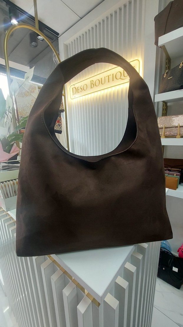 Koyu kahverengi süet çanta, minimalist ve desensiz tasarımıyla çağdaş bir stil sunar. Günlük kullanıma uygun, zahmetsiz şıklık ve klasik zarafet sağlar. "DESO BOUTIQ" markalıdır.