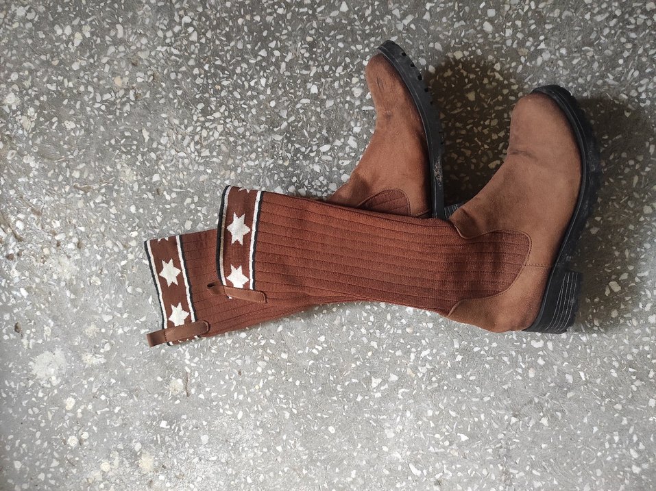 Kahverengi süet diz boyu botlar, kama topuklu, nakışlı yıldız desenleri ve kürk detaylarıyla dış mekan kullanımı için uygundur. diğer marka