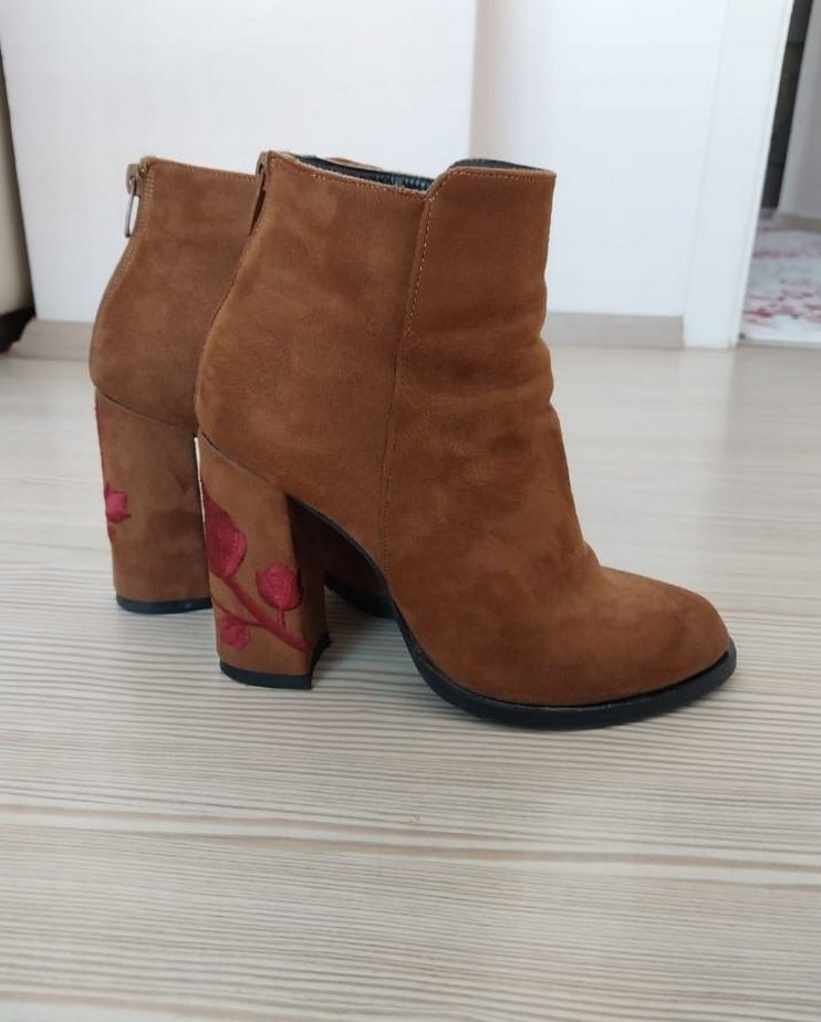 Kahverengi süet botlar, blok topukta nakışlı çiçek detayları mevcut. Elle marka. 38 numara.