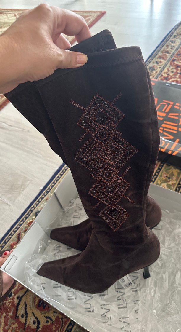 Kahverengi süet çizmeler, nakışlı bohem desenlerle ve ince topuklu stilettolarla. Rahat kullanım için fermuarlı kapama bulunur.