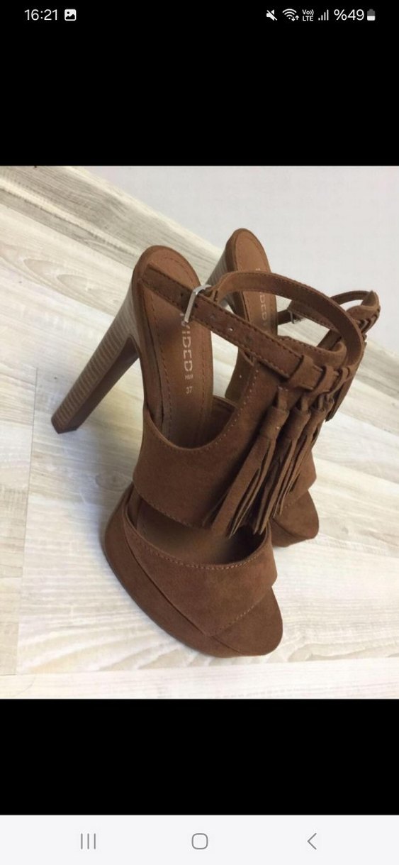 Kahverengi süet platform topuklu, tokalı ve püsküllü detaylarıyla bohem tarzda günlük kullanıma uygun kadın ayakkabı.