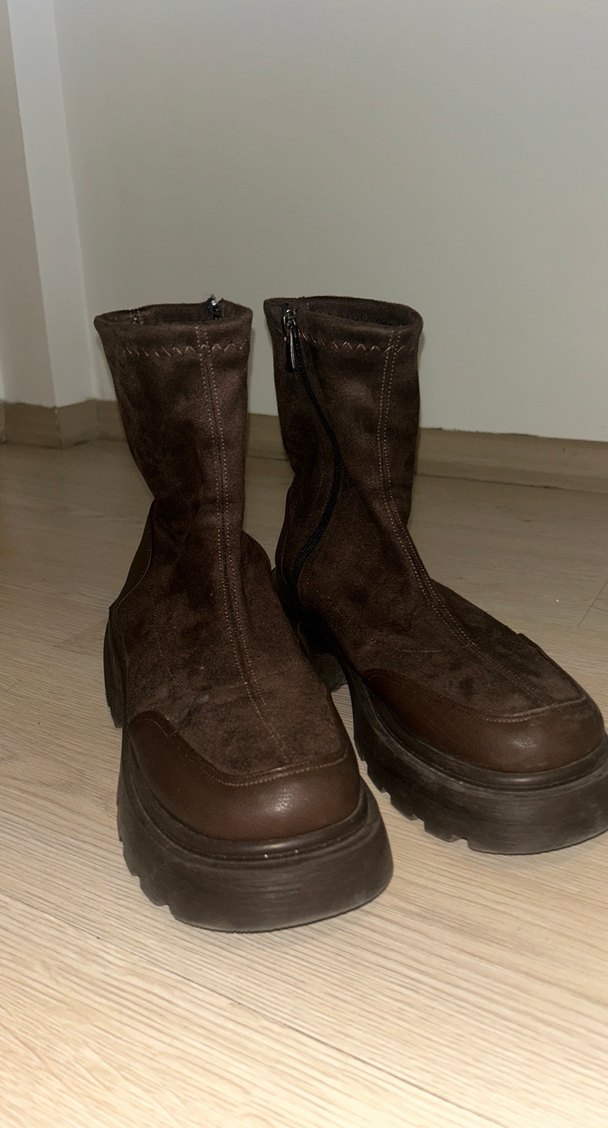 Kahverengi süet kadın botları, platform topuklu ve yan fermuarlı, rahat ve desensiz tasarıma sahip, günlük kullanım için uygun.