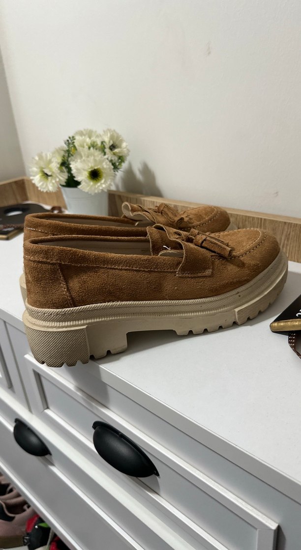Kahverengi süet kadın loafer, platform topuklu ve kemerli detaylıdır. Rahat tabanı günlük sokak stiline uygundur.