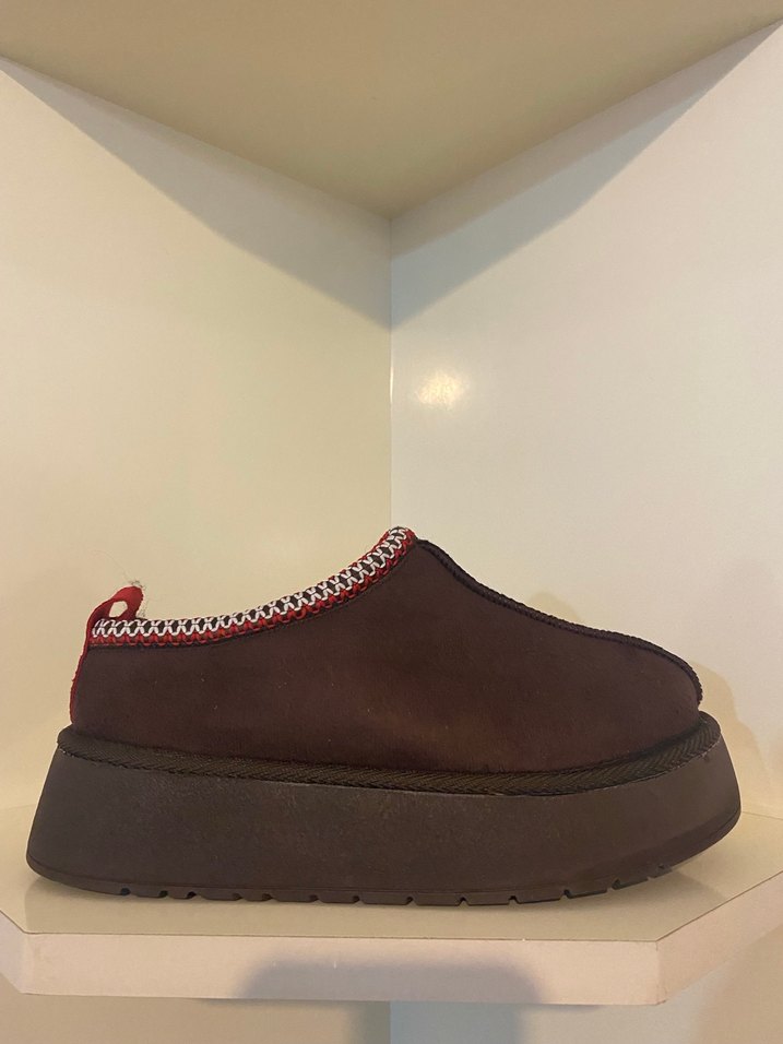 Kahverengi süet kadın terlikler, platform topuklu ve desensiz tasarıma sahiptir. Rahat ve şık, günlük kullanım için uygundur. Tüm renkleri mevcuttur.