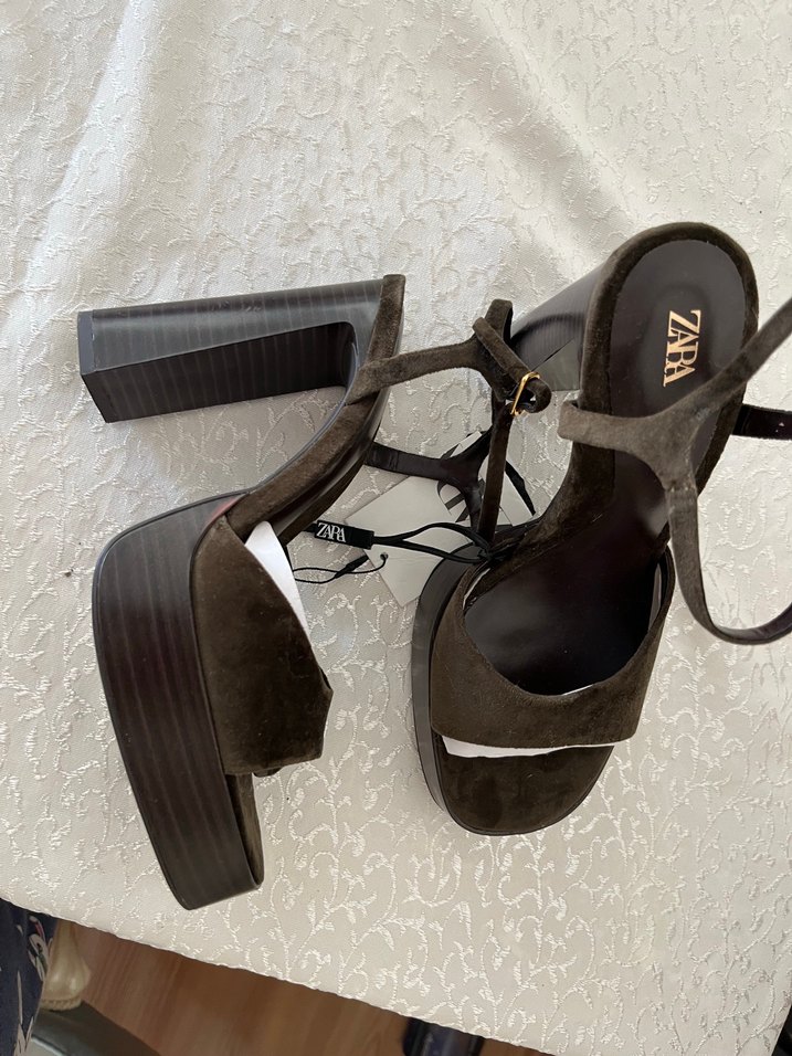 Kahverengi süet platform topuklu, tokalı bilek kayışlı ZARA sandalet, çağdaş tarzda ve desenlidir.