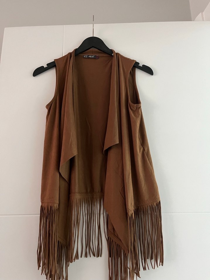 Kahverengi süet, kolsuz, askısız yaka ve püsküllü etek ucu detaylı bohem stil yelek. Bol kesim ve midi boy, günlük kullanıma uygun.