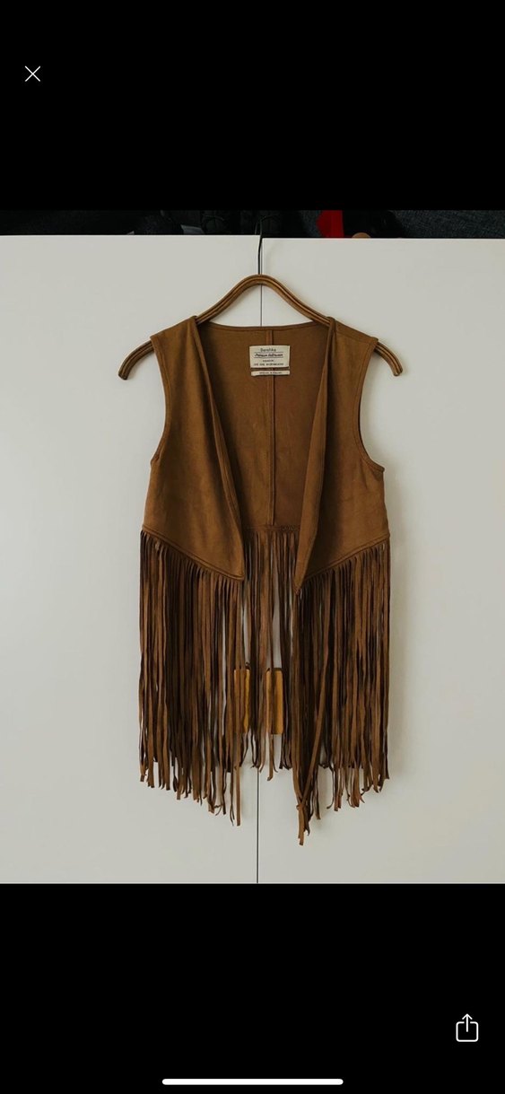 Kahverengi süet, püsküllü, kolsuz, bol kesim midi uzunluğunda bohem tarzda yelek. Günlük kullanıma uygundur.