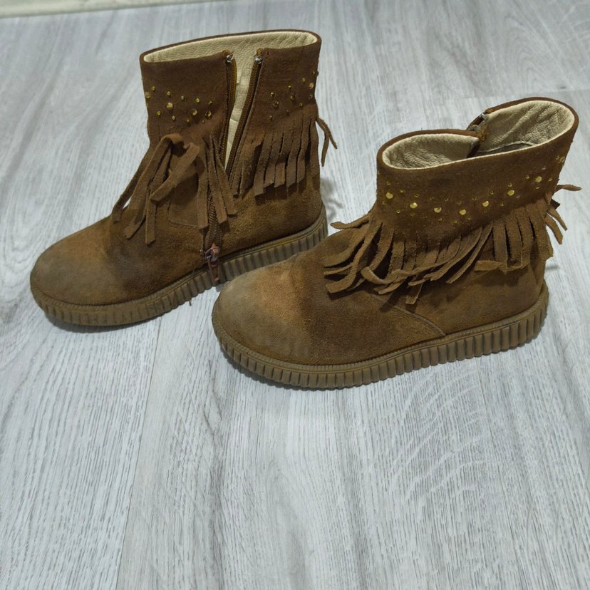 Kahverengi süet kiz cocuk bot. Püskülleri ve yan fermuarı bulunur.