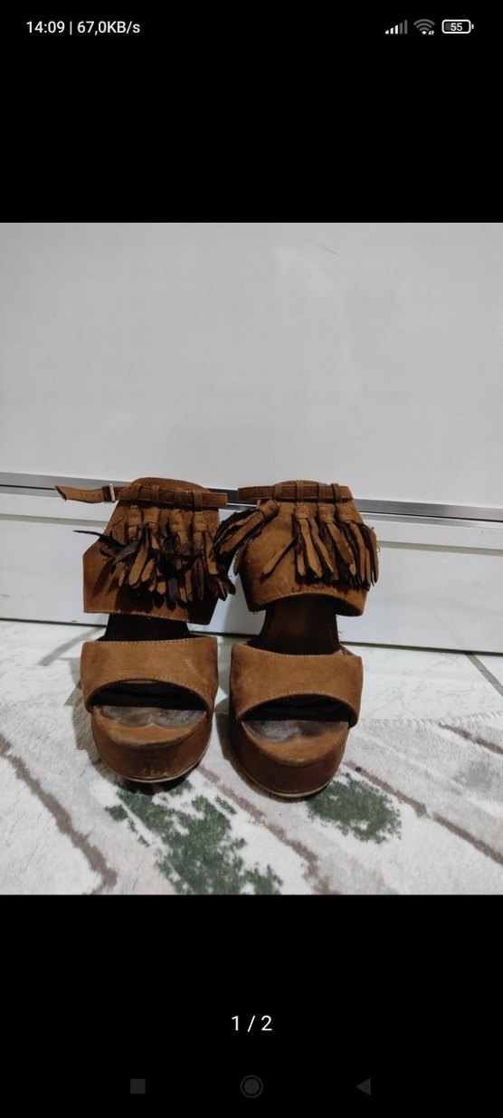 Kahverengi süet dolgu topuklu sandaletler, tokalı kayışlar ve püskül detayları ile bohem tarzı yansıtıyor. Günlük kullanım için uygun.