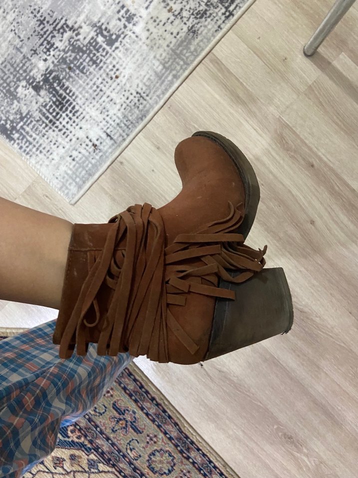 Kahverengi süet, blok topuklu kadın botları, tokalı püskül detaylarıyla bohem ve rahat bir tarz sunar.
