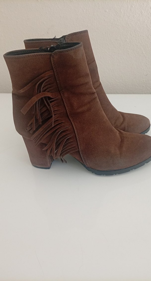 Kahverengi süet kadın bot, blok topuklu ve püsküllü detaylara sahip, rahat bohem tarzıyla günlük kullanıma uygundur.