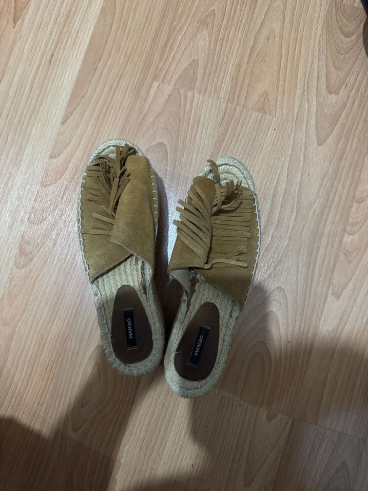 Kahverengi süet, püsküllü ve dolgu topuklu espadril, rahat bohem tarzıyla günlük kullanıma uygun, tokalı tasarıma sahiptir.