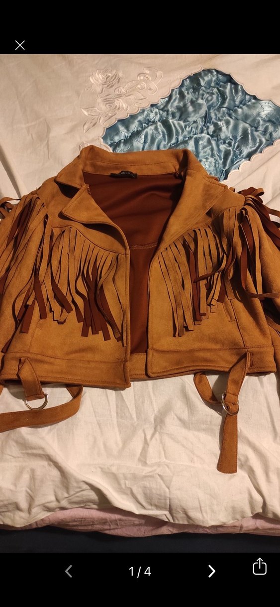 Kahverengi süet deri ceket, püskül detaylı ve kemerli bel ile. Askısız yaka ve askılı kol, bohem tarzda dar kesim. Midi boy, retro görünüm sağlar.
