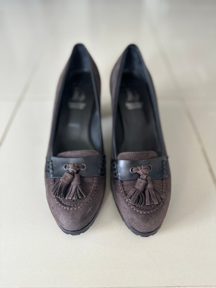 Kahverengi süet platform topuklu kadın ayakkabısı, püskül detaylı . Ofis kullanımı için klasik Paris tarzı. Çok rahat . Luca Grossi marka, italyan yapimi