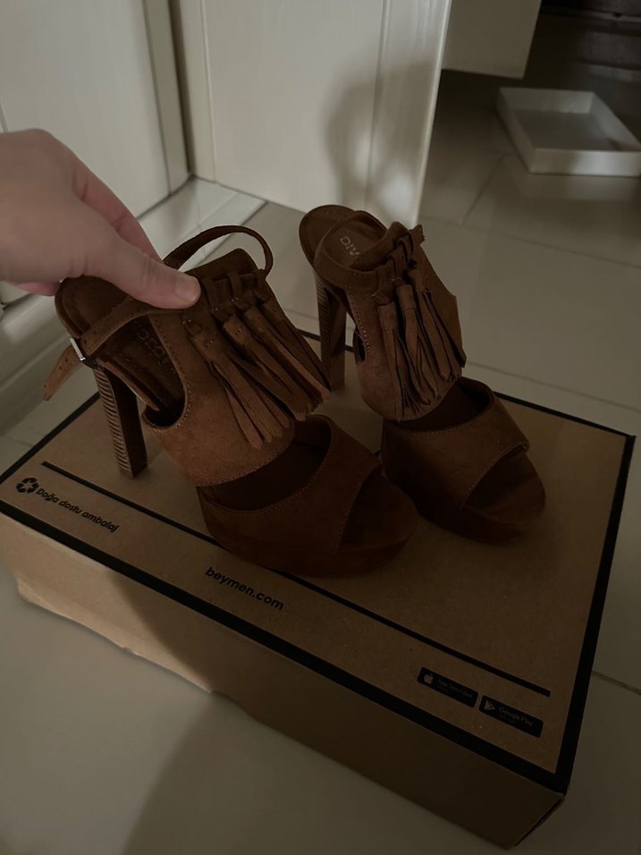 Kahverengi Süet Püsküllü Platform Topuklu Sandalet