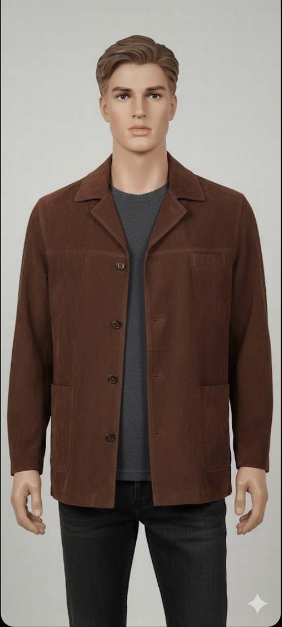 Kahverengi süet erkek ceket, kesik yaka ve düğmeli tasarıma sahiptir. Uzun kollu, regular fit ve midi boydadır. Ofis ve günlük kullanıma uygundur.