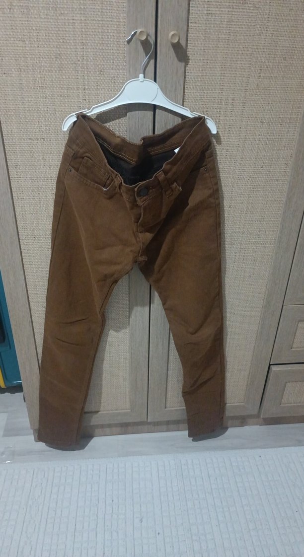 Koyu kahverengi süet malzemeden, bel detaylı ve salaş kesim erkek pantolon. Normal midi boyda, günlük rahat sokak stili için uygundur.