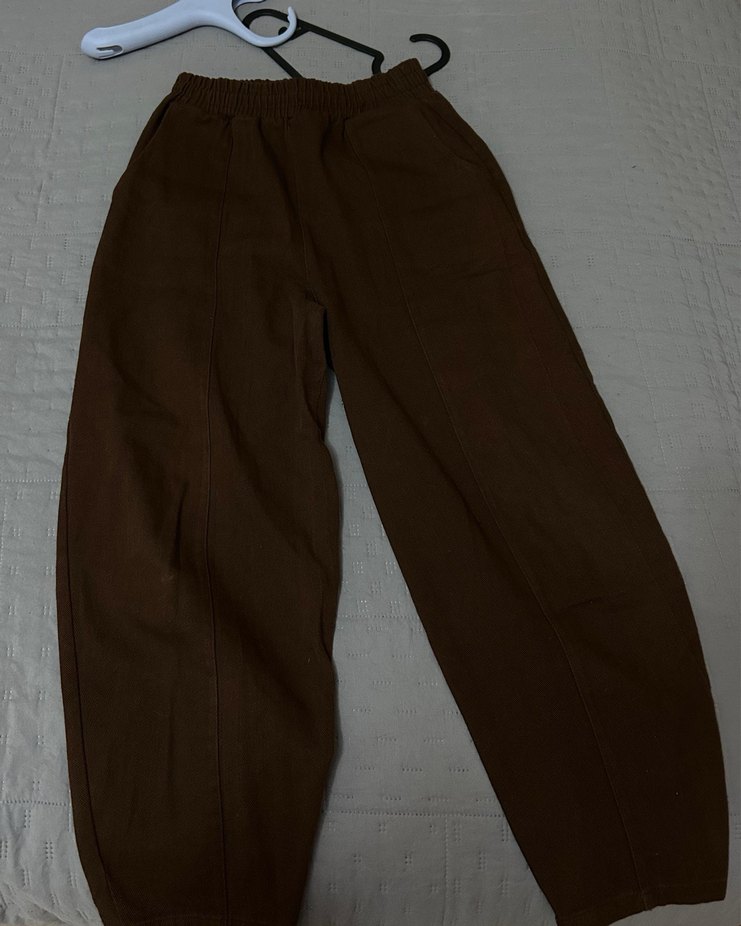 Kahverengi süet kumaştan, salaş kesim ve normal midi boyda kadın pantolon , minimalist ve zahmetsiz şıklık sunar. ️
