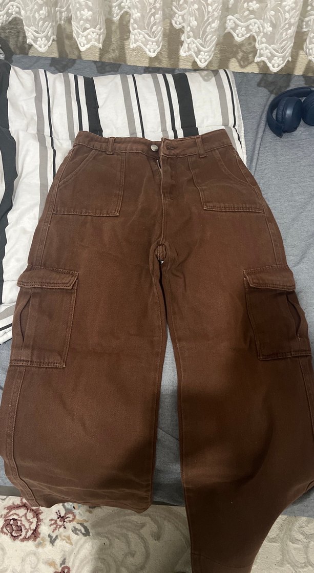 Kahverengi süet, salaş kesim, midi uzunlukta kadın jean. Kemer detaylı ve çok cepli, günlük kullanıma uygun rahat sokak stili jeans.