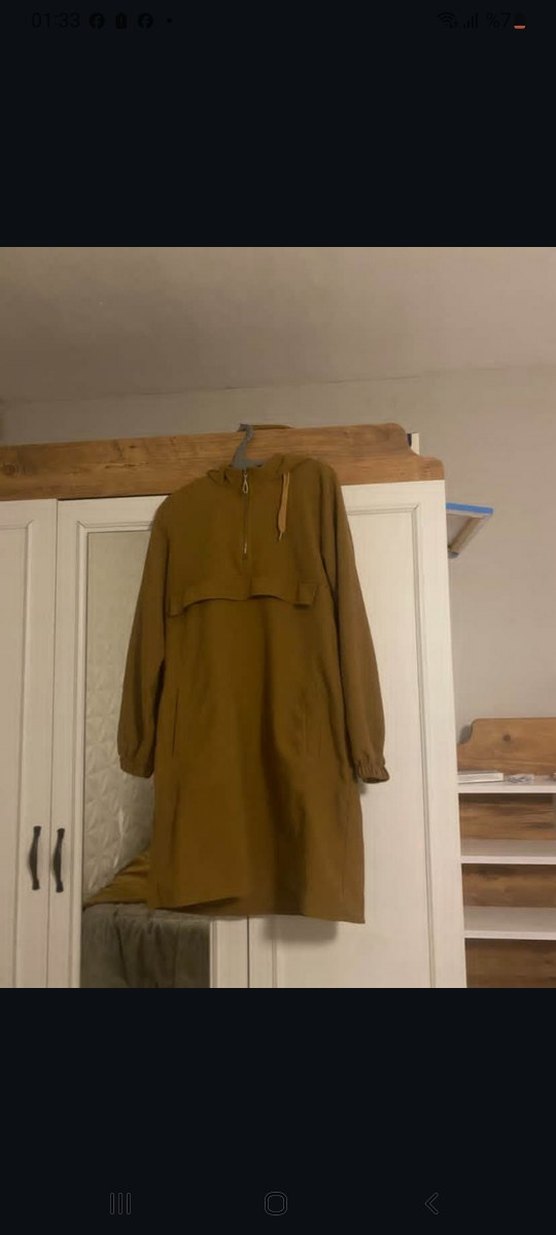 Kahverengi süet kumaştan, salaş kesim ve drapeli tasarıma sahip uzun hamile ceketi. Yüksek yakalı ve uzun kolludur, günlük kullanıma uygundur. Rahat ve şık bir sokak stili ürünü.