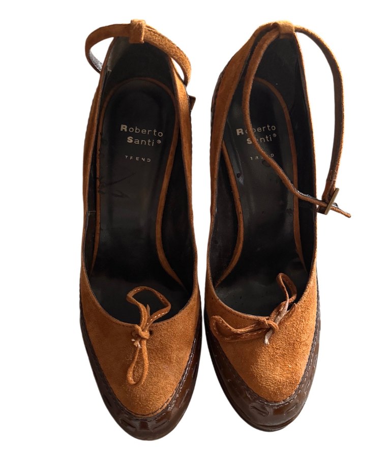 Kahverengi süet stiletto topuklu, parlak ve tokalı kayışa sahip Roberto Santi tasarımı. Romantik geceler için şık ve bohem tarzda.