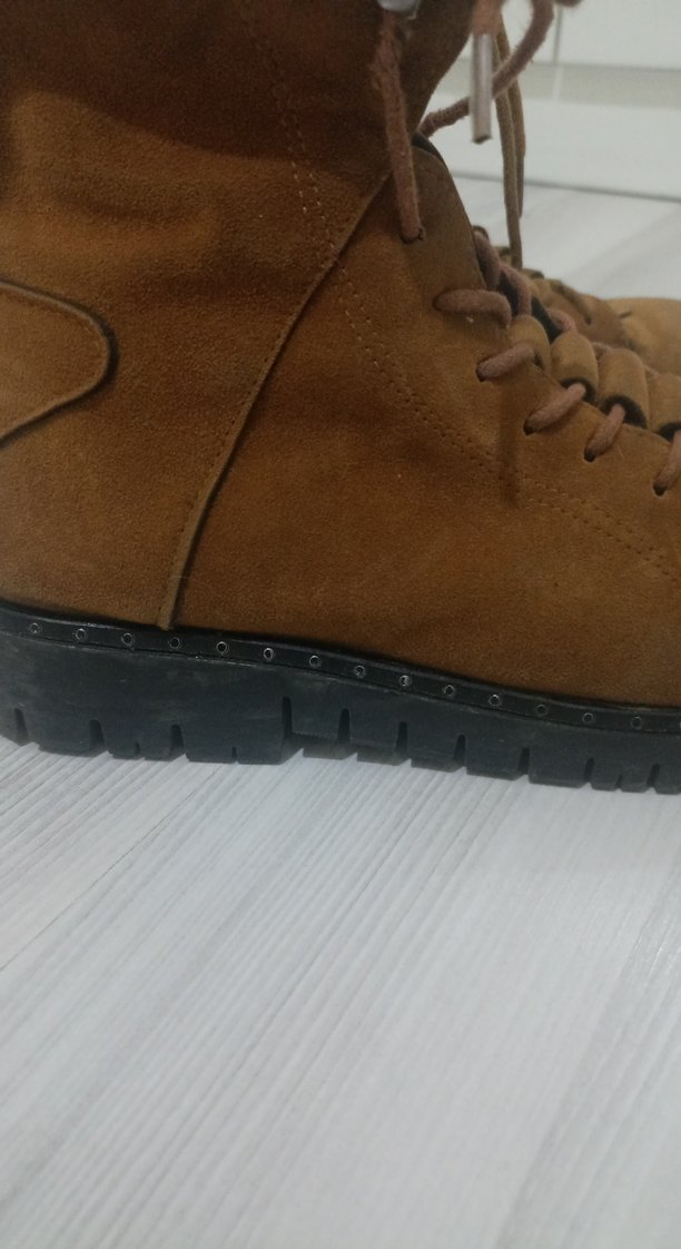 Kahverengi süet kadın botu, stiletto topuklu ve tokalı detaylara sahip, parlak görünümlü, sokak tarzı ve günlük kullanıma uygun.
