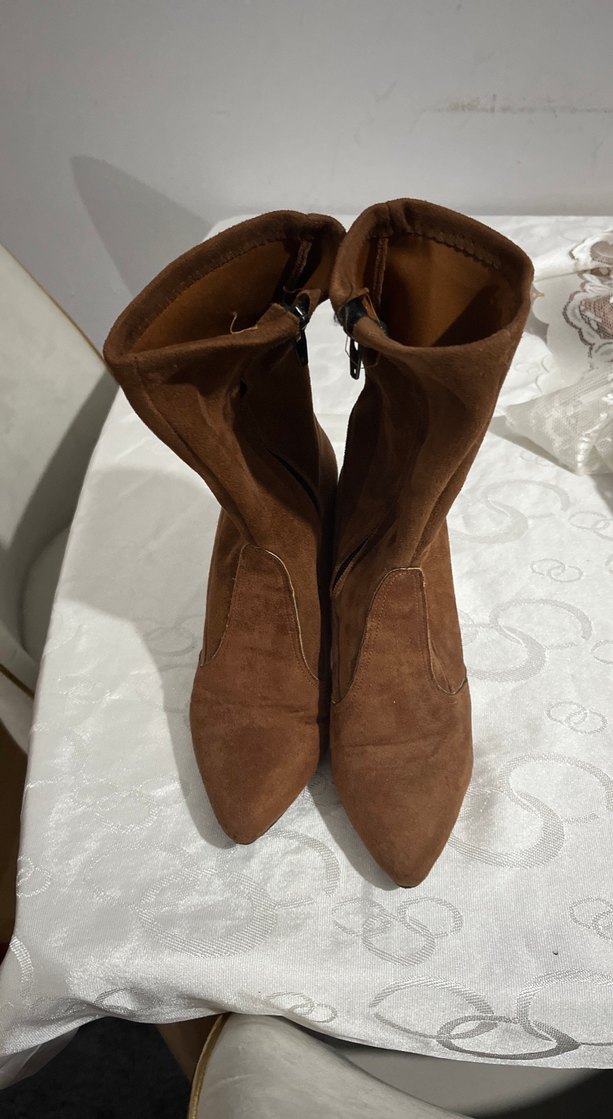 Kahverengi süet kadın botlar, stiletto topuk ve tokalı detaylara sahiptir. Günlük kullanıma uygun, rahat ve çağdaş bir stile sahiptir. Desensiz ve koyu renklidir.