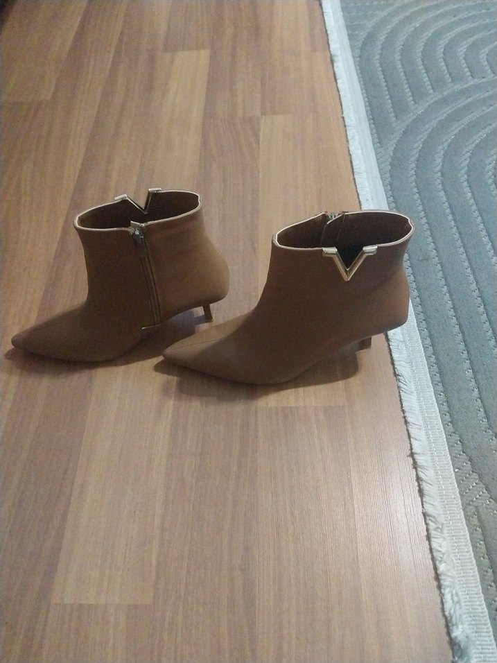 Kahverengi süet, stiletto topuklu kadın bot. Minimalist ve deseniz, tokalı detaylı çağdaş tarzda, günlük kullanıma uygun.