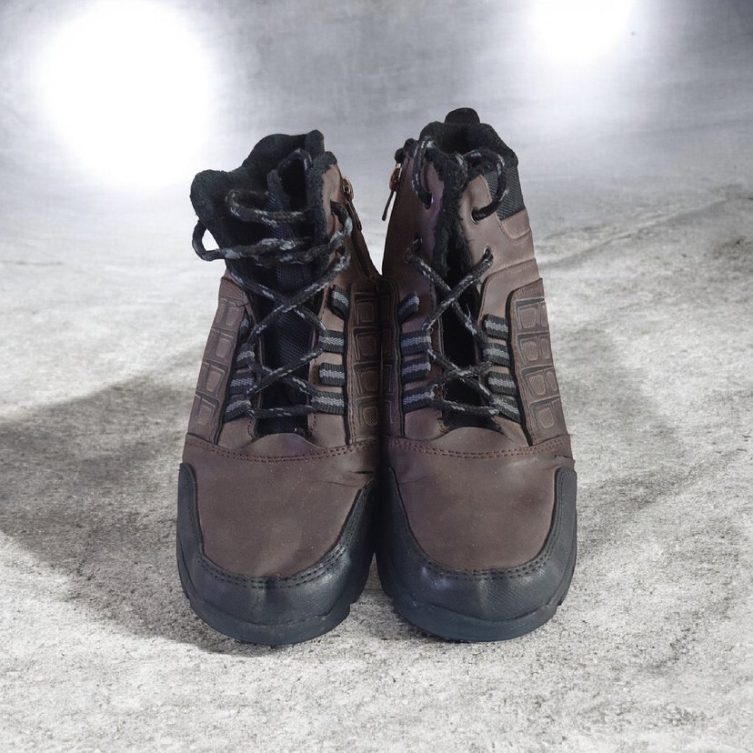 Koyu kahverengi süet malzemeden, tokalı ve bağcıklı dış mekan biker botları, trend atletik günlük stil için uygundur.