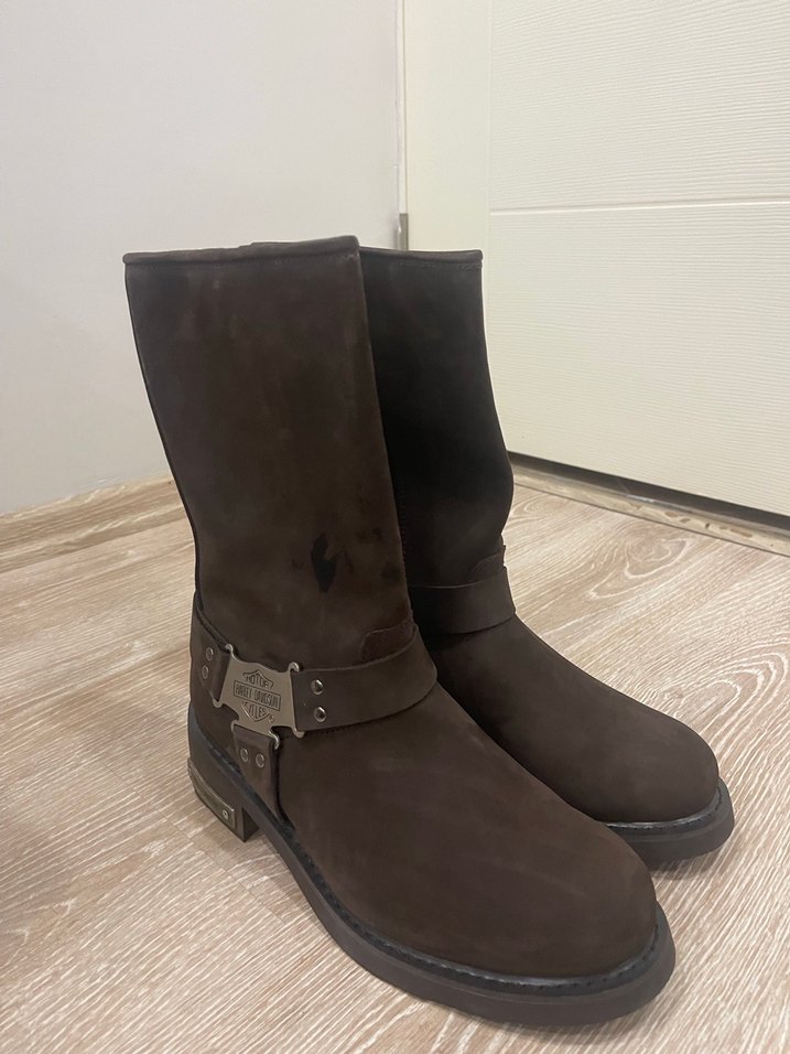 Koyu kahverengi süet malzemeden, tokalı detaylı ve blok topuklu biker tarzı erkek bot, günlük kullanıma uygun rahat bir model. Hatley-Davidson erkek bot sadece 1 kez kullanıldı hiçbir defosu problemi yoktur eşime olmadığı için satıyorum süettir orjinal kutusu ile gönderilecektir